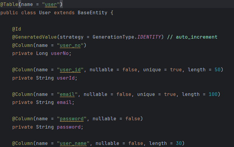이후 User 엔티티에서는 이를 상속받도록 한다.