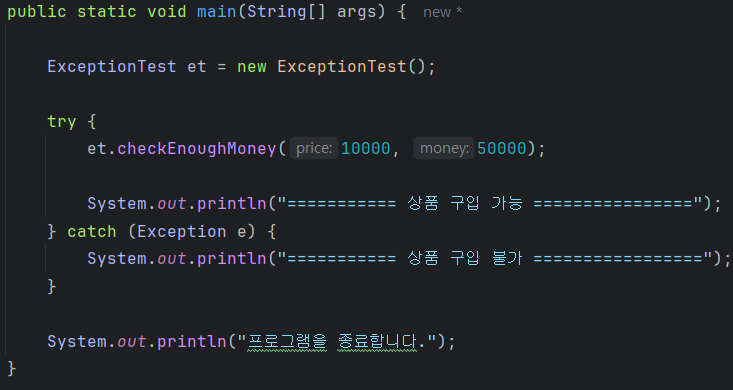 2) 결국 언젠가는 이렇게 try-catch를 통해 예외처리를 해야 한다. 오른쪽 코드는 위 사진에 있는 Exception Class를 호출하여 checkEnoughMoney라는 메소드를 try하는데, Exception이 발생할 경우 "상품구입불가"라는 메시지가 출력되도록 한 것이다.